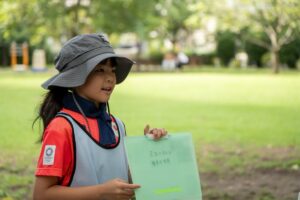 イクシバキッズの4年生のKちゃん。夏休みの学校の自由研究で芝生のことをしてる、雑草のことを書くとは先月から聞いていました。