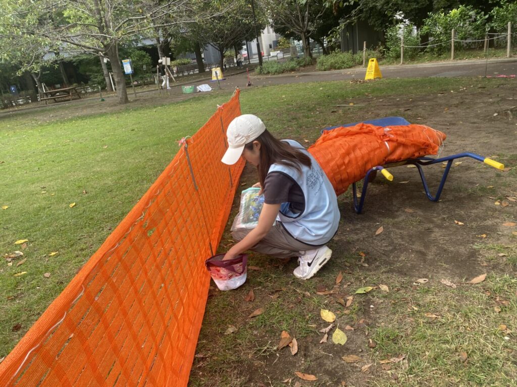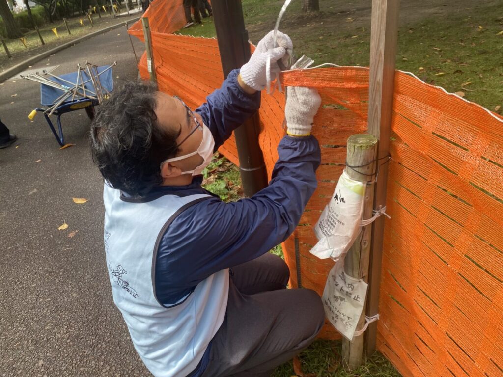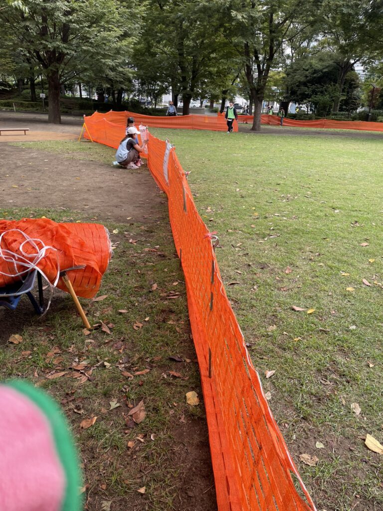 まず、大体の位置に杭を置いてゆく(一周)→オレンジネットを広げてゆく人→先ほど杭の位置からネットが弛まない位置を調整しネットにぐし縫いしてゆく人→ぐし縫い杭を引っ張る人&トンカチで打ち付ける人