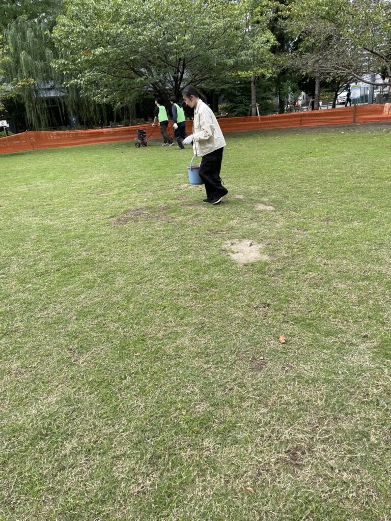 施肥マシン初めて!という学生さんに、施肥マスターfkfkさんから手解き。この赤ちゃん芝生にドバーっとまいてしまうと被害が大きいので、内心、大丈夫かなとヒヤヒヤしたいたのですが、問題なし。飲み込み早い!うまく均等にまいてくれました。学生さんありがとうございました。