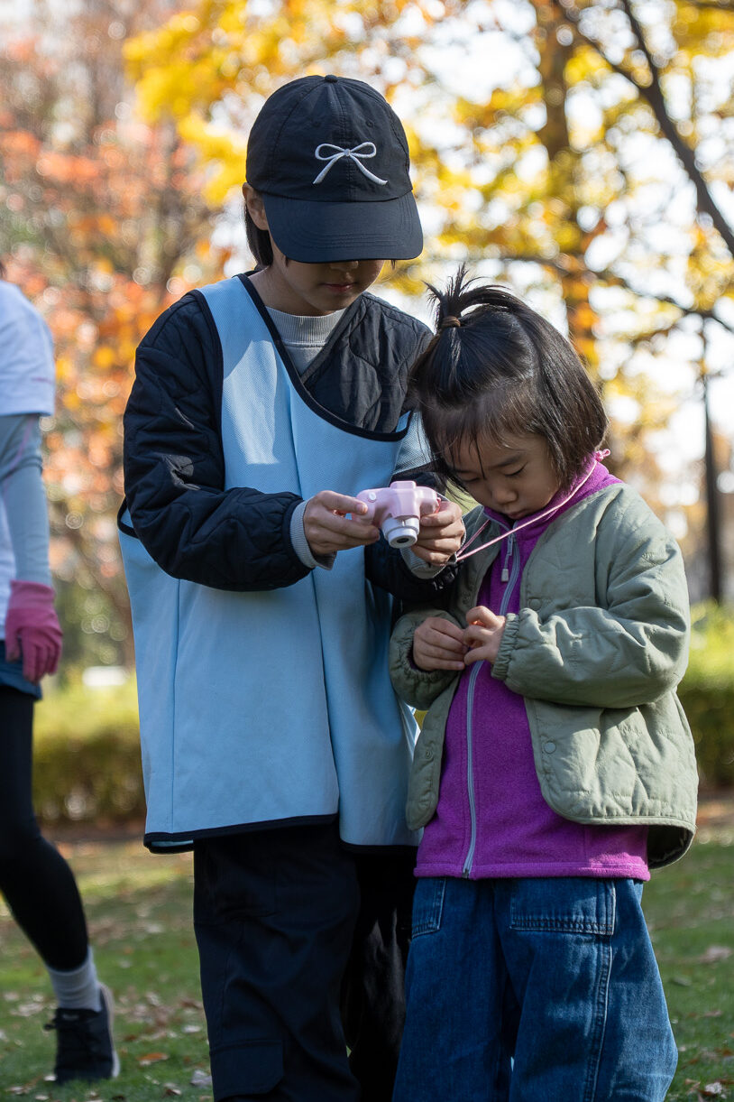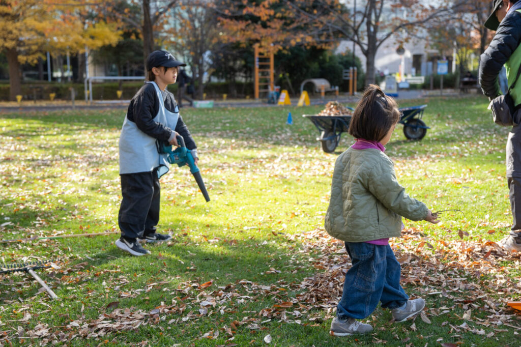 まだ芝刈り機を押せない妹ちゃんと一緒に、おねちゃん、もっとお姉さんと一緒に落ち葉かきをしてくれています。