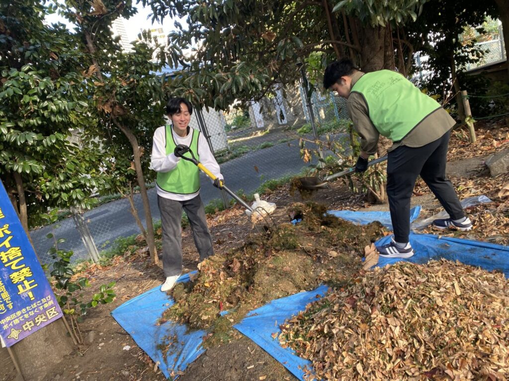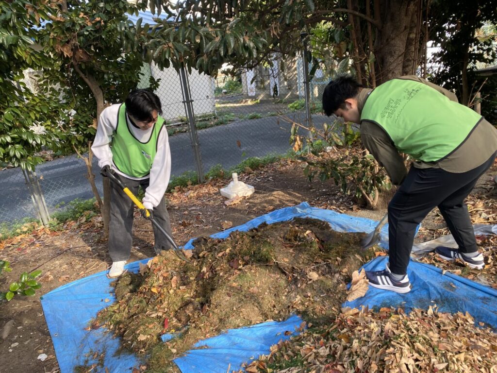 水分を多く含む冬芝の葉をコンポスト材料にするため乾かしています。一番力仕事なので25歳同級生チームに任せます。今日はいい感じ、「そんなに腐敗臭もしないねー!」と応援しにゆくと、「しますって!臭いです!」と。笑!ごめんごめん、失礼しました。ありがとう!!