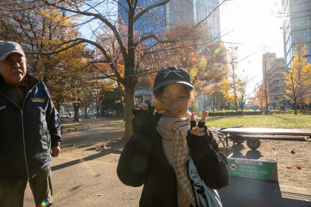 蝶々の餌になるように柑橘の木が植えられている黎明橋公園。この木の世話を大将がしてるので、イクシバキッズに時々収穫をお裾分けしてもらいます。