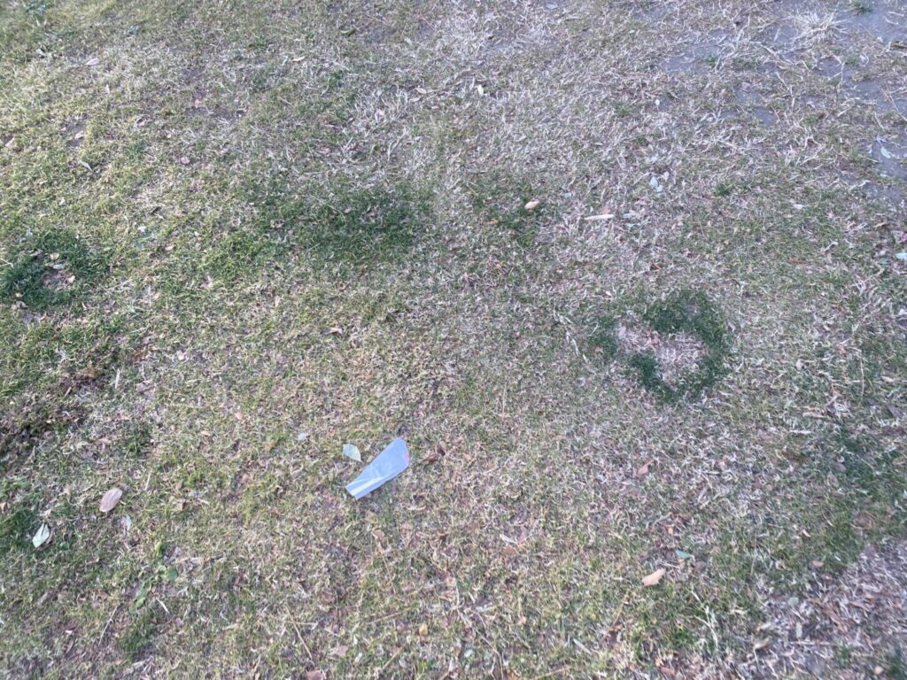 躾をきちんとしてくださってる飼い主さんが大半で、その飼い主さんのワンちゃんは芝生に見向きもしませんが、この円形の濃い緑の中の真ん中部分。これがおしっこハゲです、この中の芝生はマジ枯れ(死んでしまって)します。タネをまき、水をやり、気落ちを込めて育ててるみんなの公園芝生です。