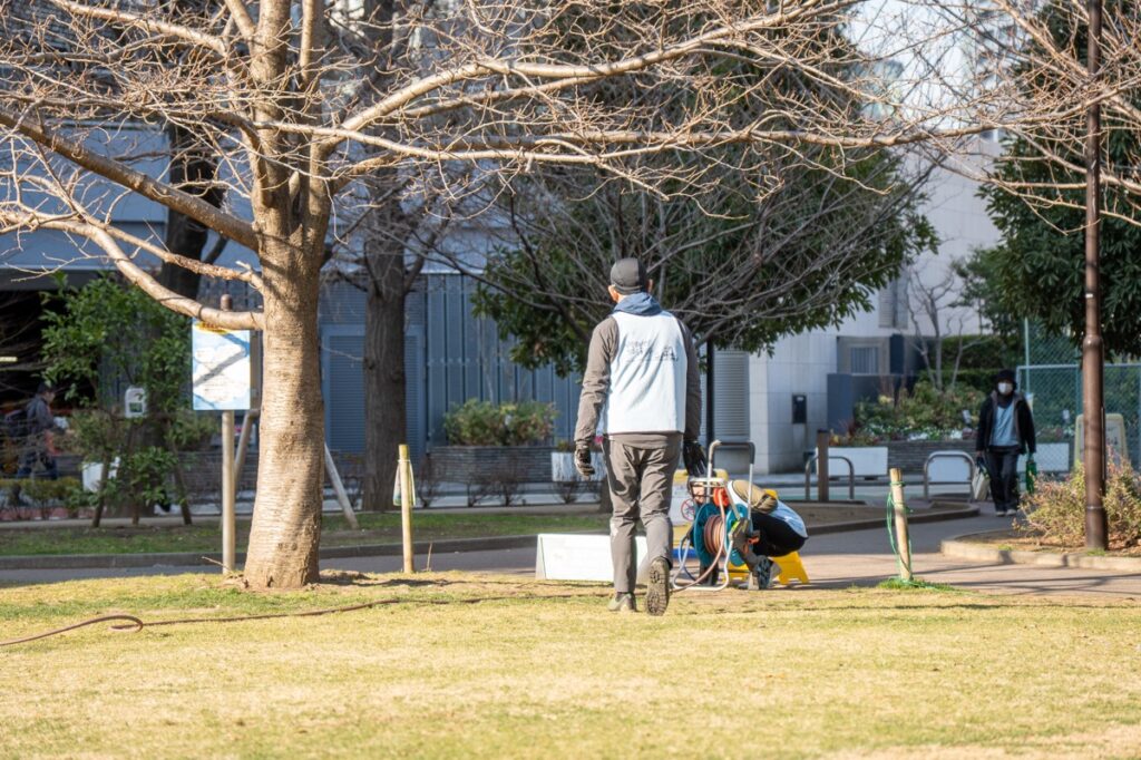 カラカラな芝生くんたち。カラカラ渇水気味です。本当はみんなで手分けして、みんなで仕事を分け合うのですが、芝生は1秒でも長く水が欲しいので、来た人から散水開始