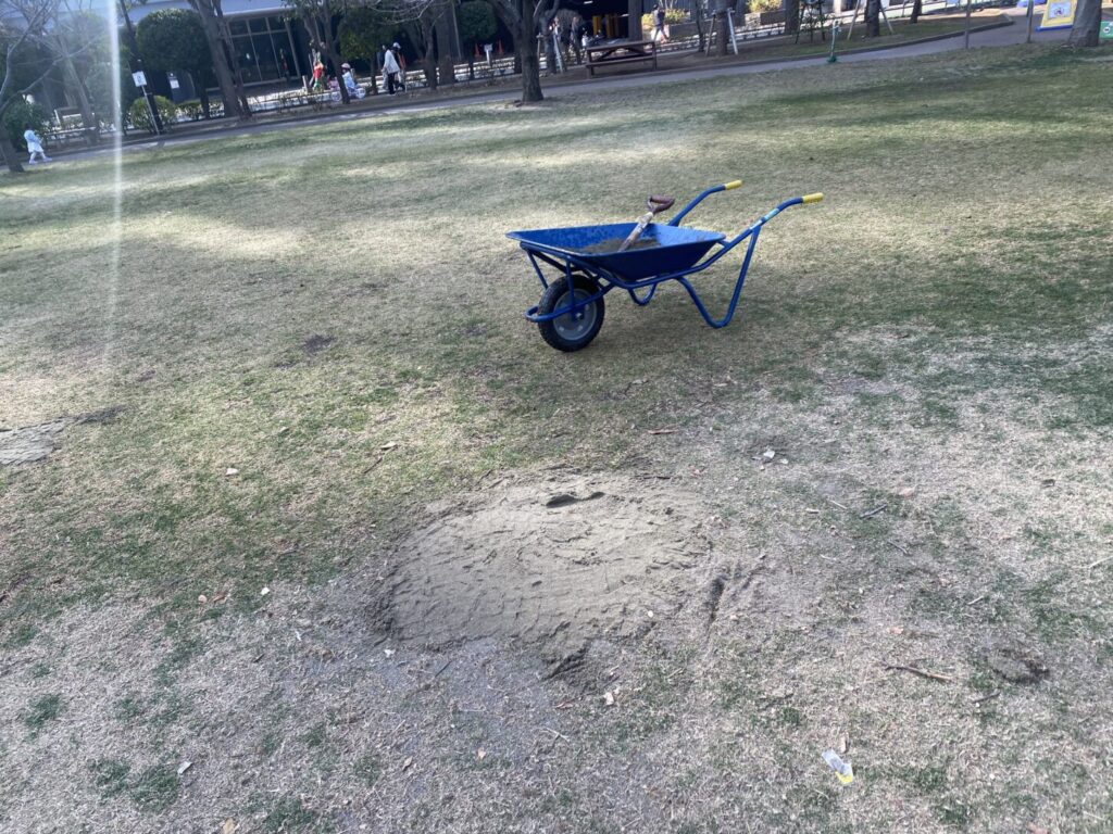 穴掘られてます。なにこれ?手では難しのでは?ここに芝生は生えません。根っこも抉れてかわいそうに
