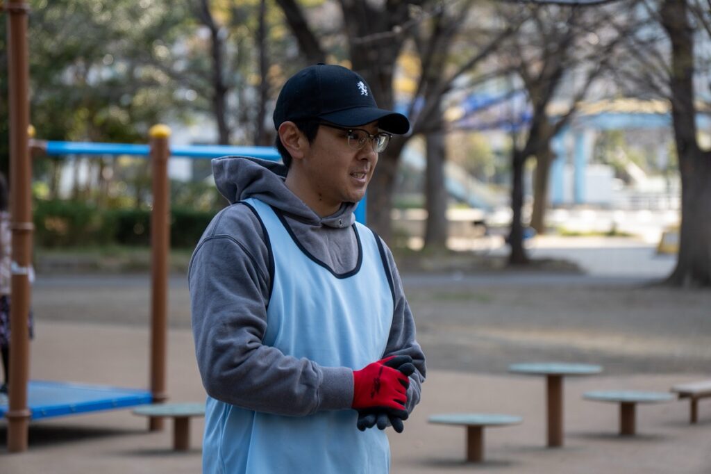 作業もするよ!サポーターさんにはマイビブス(青)を支給しています。