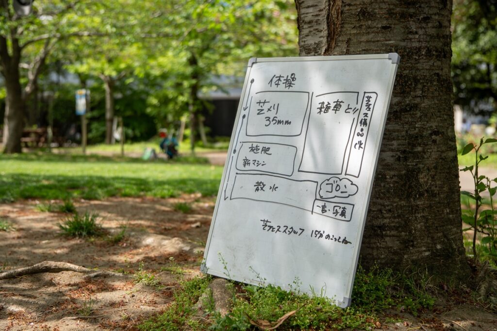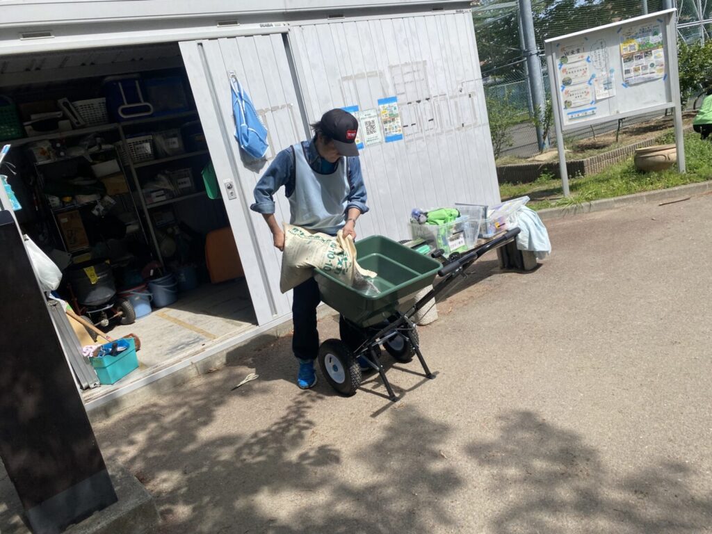 朝来たらみんなで倉庫から道具を出し・・・